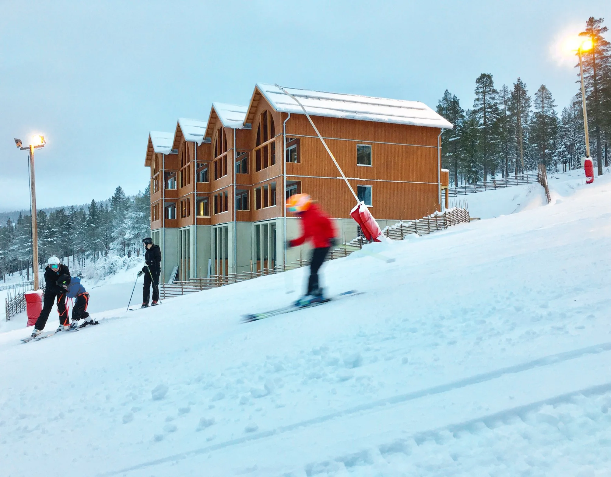 Nytt flerfamiljshus i Björnrike, Härjedalen. 12 lägenheter med direkt anslutning till skidbacken och utsikt över Vemdalen.